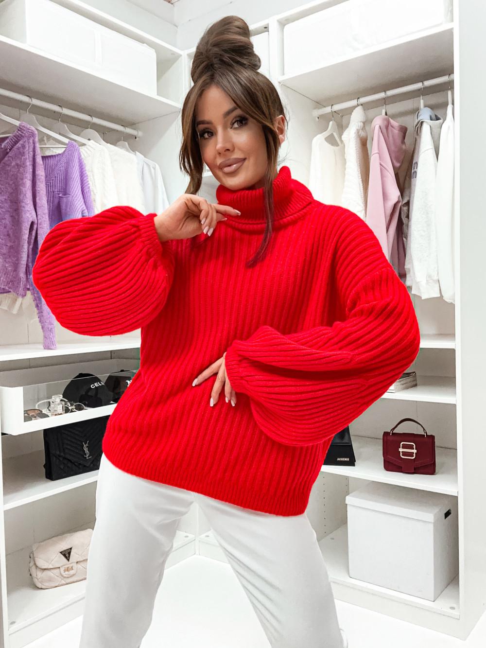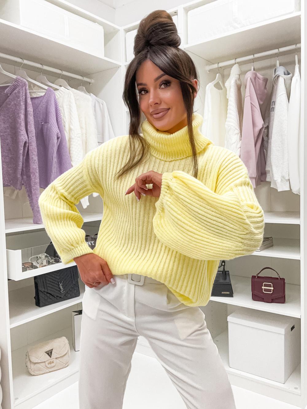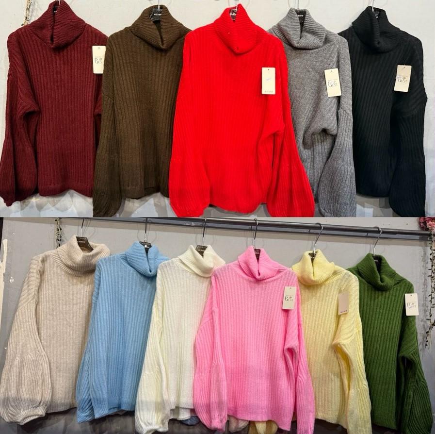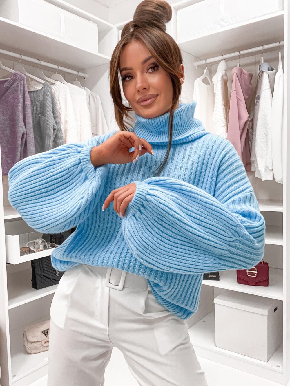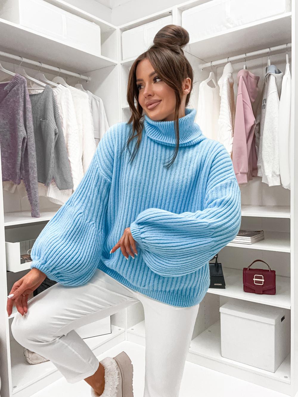 Jersey de punto grueso con cuello vuelto y mangas abullonadas. Cómodo, calentito y muy favorecedor para looks de invierno.