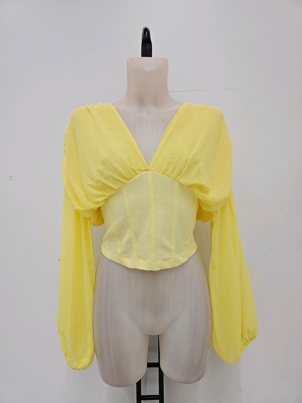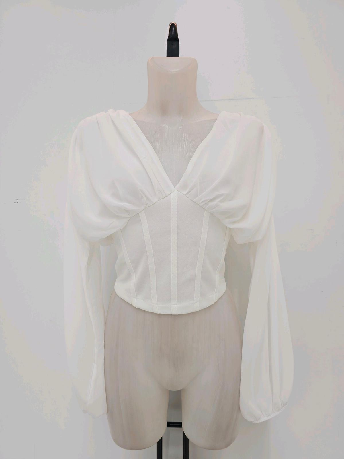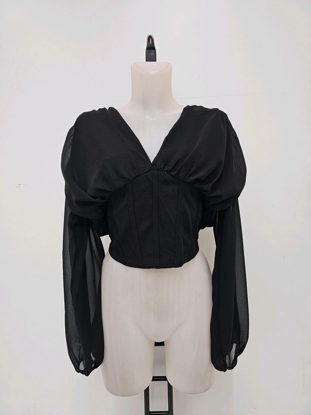 Blusa corsé con escote pico drapeado y mangas largas de gasa vaporosa. Elegante, femenina y muy favorecedora.