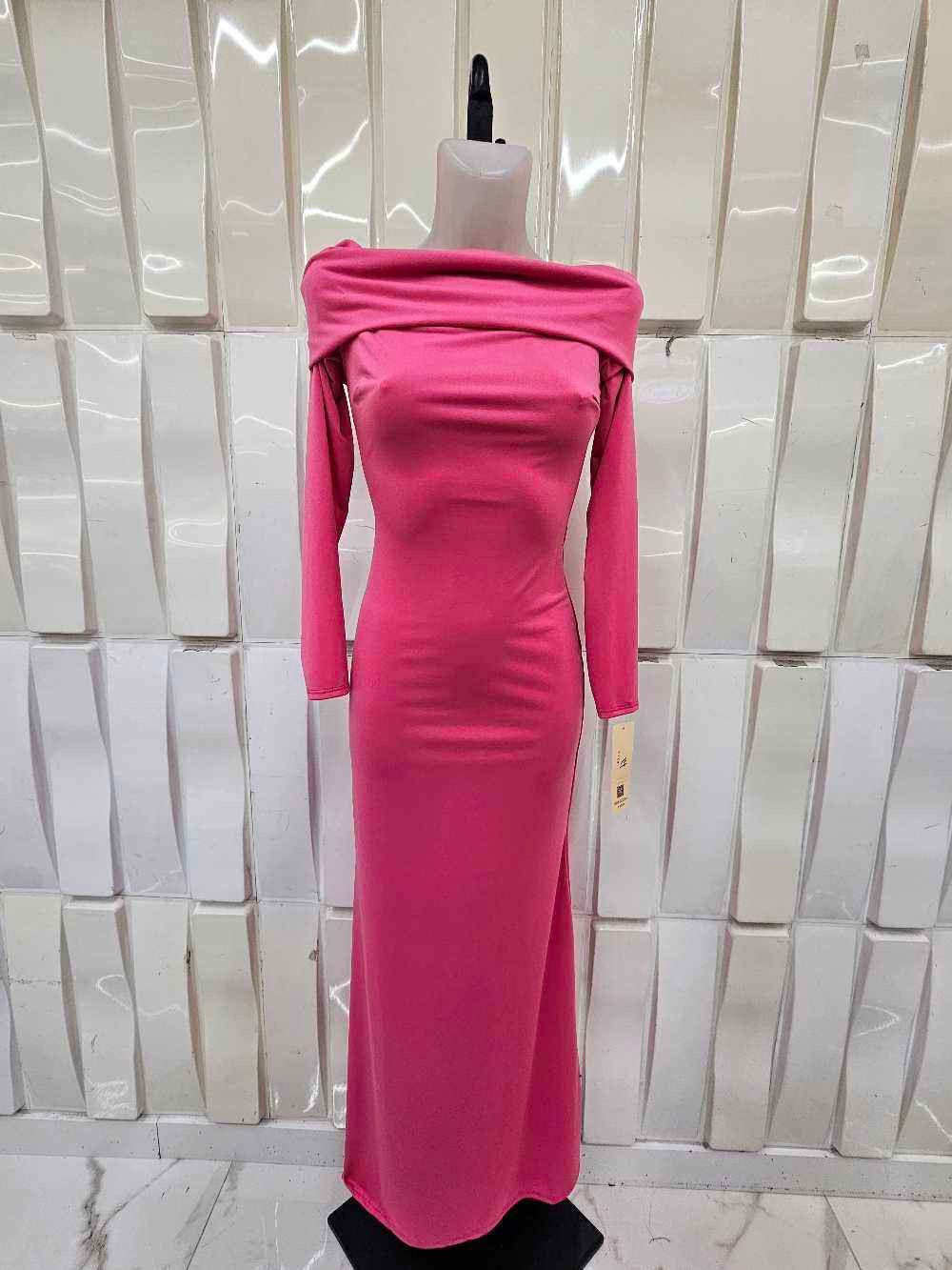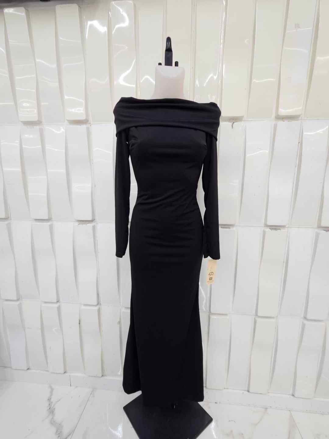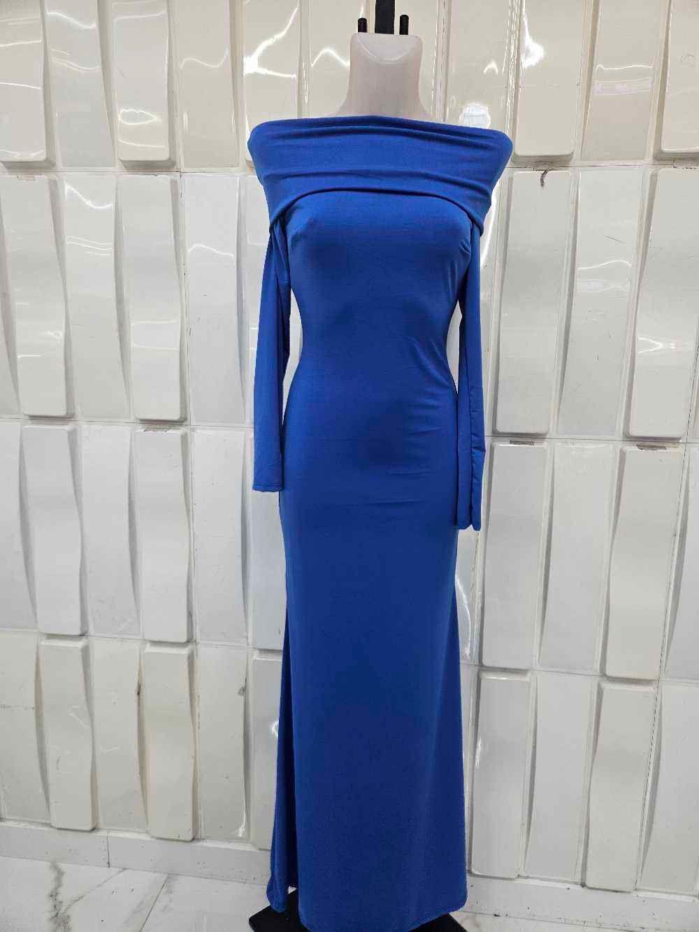 Vestido largo palabra de honor con mangas largas y tejido elástico que estiliza la silueta. Elegante, femenino y perfecto para eventos especiales.
