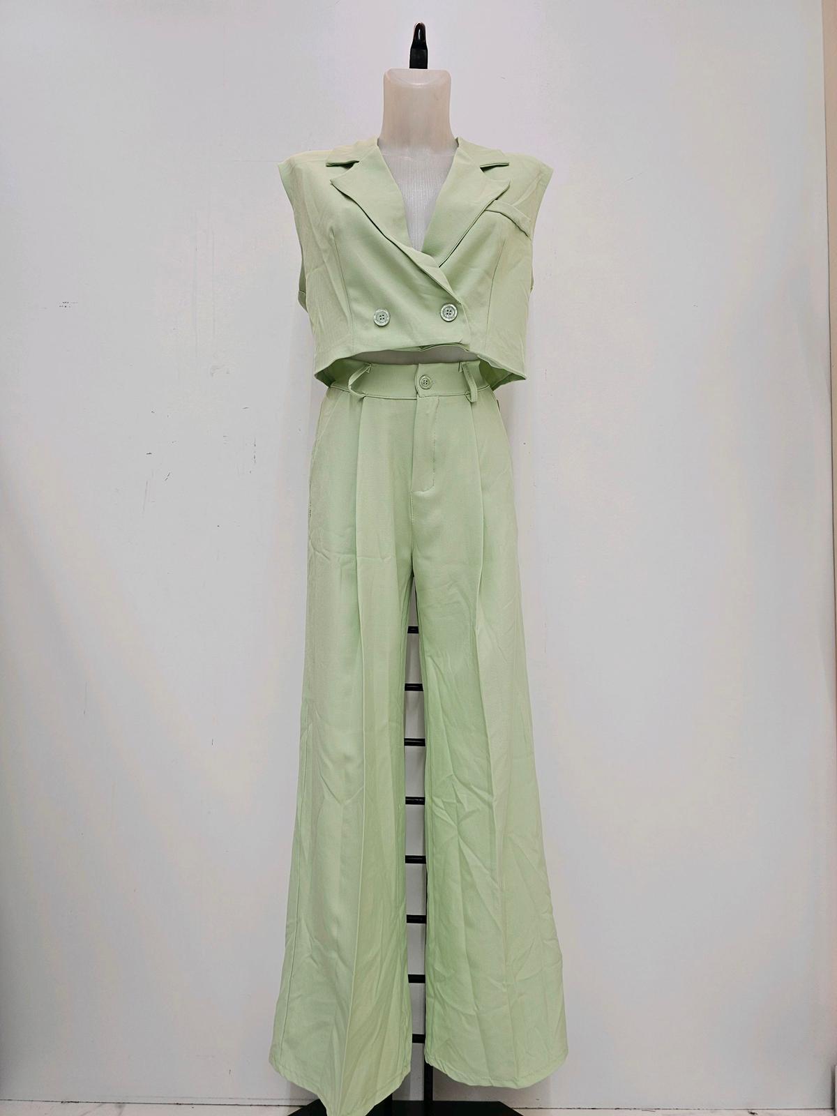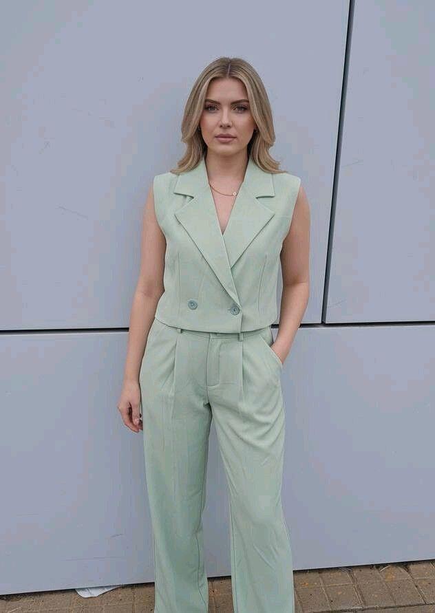 Este conjunto es la definición de elegancia relajada. Formado por un chaleco sin mangas de corte cruzado y un pantalón largo de pernera ancha, crea un look sofisticado, actual y muy versátil para eventos de día, celebraciones especiales o incluso ocasiones más formales con el estilismo adecuado.