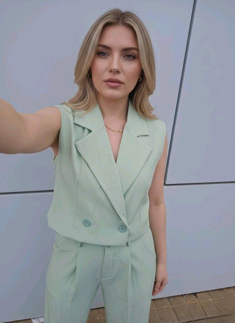 El chaleco destaca por su diseño tipo blazer, con solapas marcadas y cierre frontal que estiliza la parte superior, aportando estructura sin perder ligereza. El pantalón, de tiro alto y caída fluida, alarga visualmente la silueta y aporta movimiento, haciendo que el conjunto resulte cómodo y favorecedor a partes iguales.