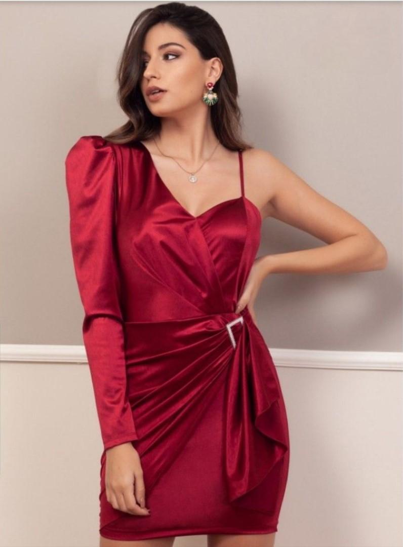 Este vestido es puro efecto “wow” sin esfuerzo. Su tejido satinado aporta brillo elegante, mientras el diseño asimétrico con un solo hombro crea una silueta sofisticada y muy femenina. El drapeado lateral estiliza la cintura y realza las curvas de forma natural, con un detalle joya que eleva el conjunto y lo hace especial.